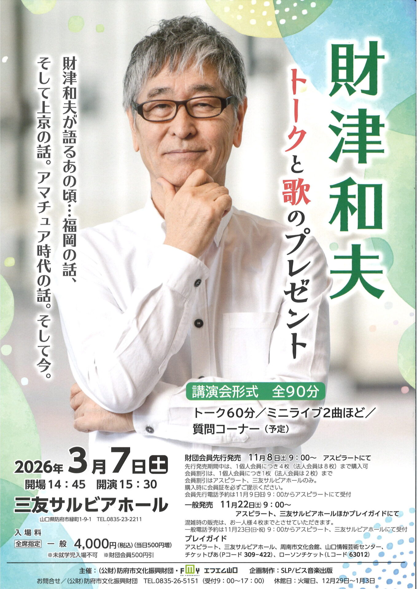 本公演(全90分)は講演会形式となっており、財津さんが自身の生い立ちやアマチュア時代、デビューまでの道のり、「TULIP」時代、現況などについて語ります。また、2曲ほどのミニライブを行なう他、質問コーナーも実施予定。