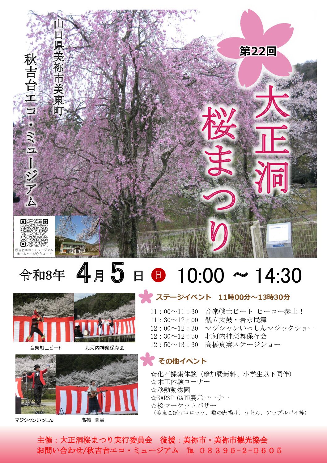 会場では、参加無料の化石採集体験(小学生以下は要保護者同伴)、木工体験コーナー、移動動物園等が展開。美東ごぼうコロッケ、唐揚げ、うどん、アップルパイなどが販売される「桜マーケットバザー」も気になります。