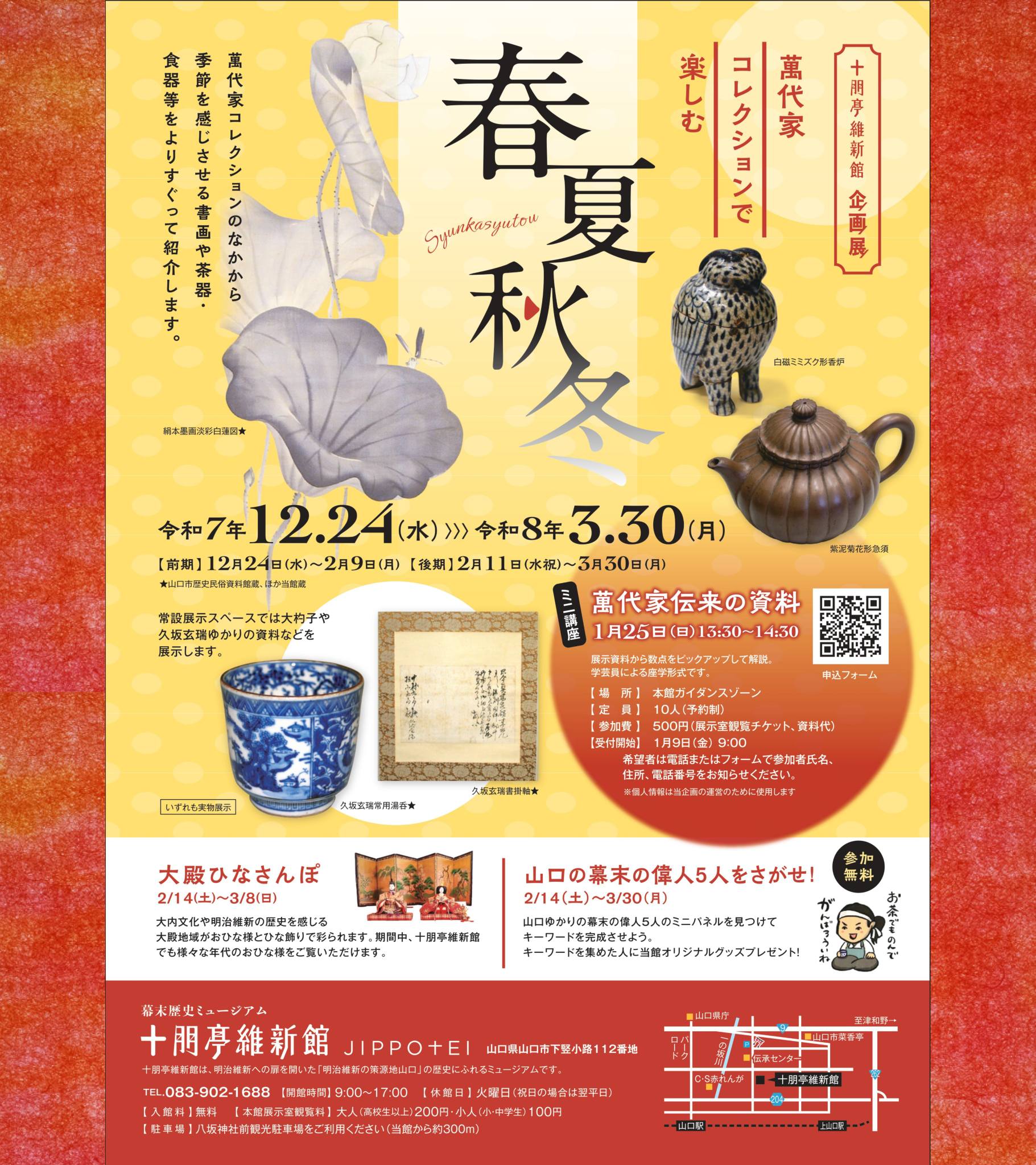 萬代家は江戸時代より当地で醤油醸造業を営んでいた豪商。幕末維新期には、同館敷地内にある萬代家の離れ「十朋亭」(山口市指定史跡)を多くの志士たちが利用しました。