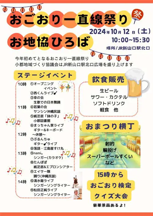 10月12日(日)10時から15時まで、新山口駅北口駅前広場(山口市小郡令和)及びその周辺で「第2回おごおり一直線まつり」が開催されます。