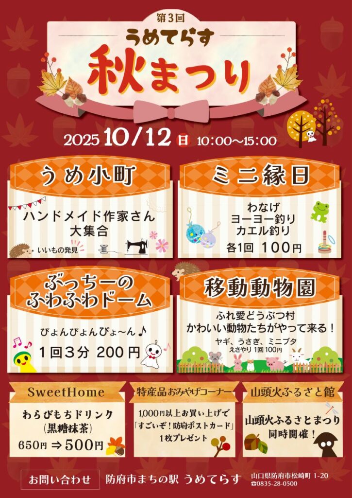 10月12日(日)10時から15時まで、防府市まちの駅「うめてらす」(防府市松崎町)で「第3回うめてらす秋まつり」が開催されます。