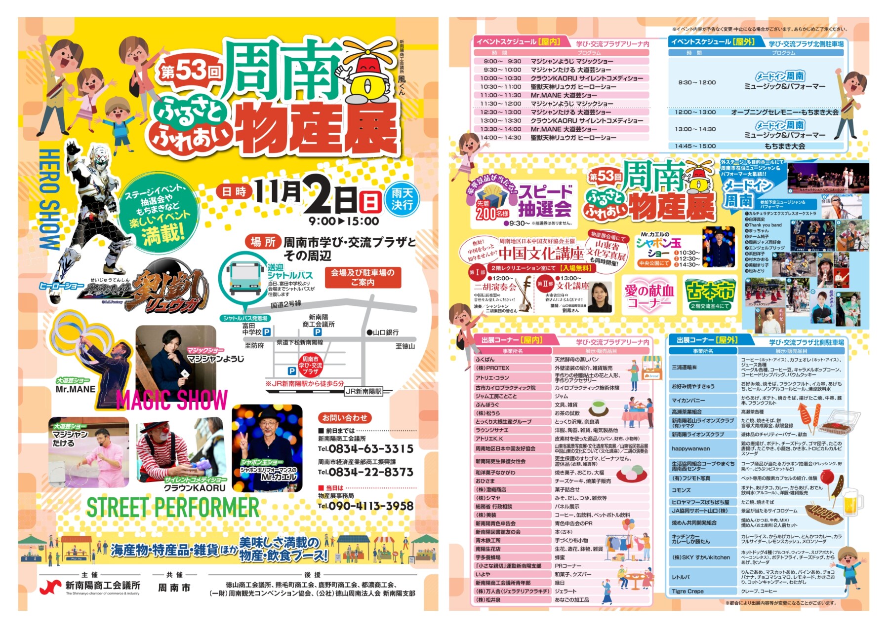 11月2日(日)9時から15時まで、周南市学び・交流プラザ(周南市中央町)及びその周辺で「第53回周南ふるさとふれあい物産展」が開催されます。