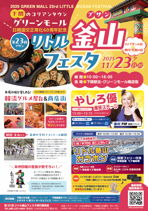 さらに、ボートレース下関協賛イベント「やしろ優爆笑ステージ」13時から。この他、「関釜フェリー特等船室ペア往復乗船券」や「星野リゾート5万円宿泊券」等が当たるガラポン抽選会(1枚700円、空くじなし)もあり。開・閉会式では韓国餅まきも予定されています。