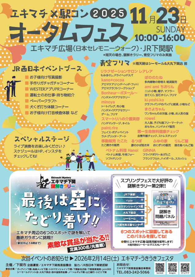 11月23日(日祝)10時から16時まで、エキマチ広場(JR下関駅前人工地盤、日本セレモニーウォーク)で「エキマチ×駅コン2025 オータムフェス」が開催されます。