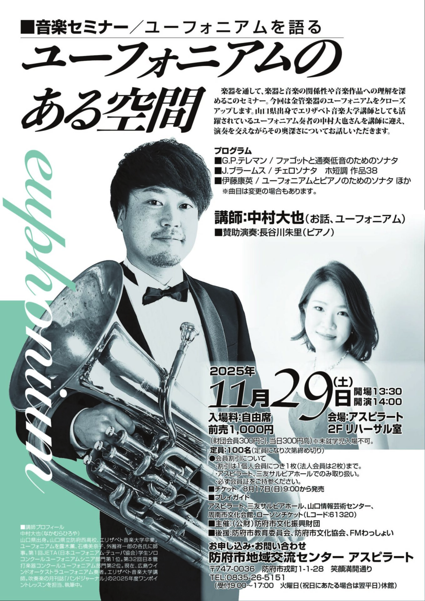 11月29日(土)14時から、アスピラート(防府市戎町)2階リハーサル室で音楽セミナー「ユーフォニアムを語る ユーフォニアムのある空間」が開催されます。