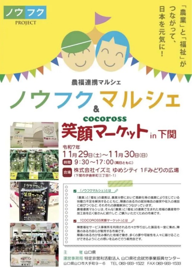11月29日(土)30日(日)、ゆめシティ(伊倉新町)1F・緑の広場で、県内の障害福祉サービス事業所が集まるマーケット「ノウフクマルシェ&Cocoross笑顔マーケットin下関」が開催されます。