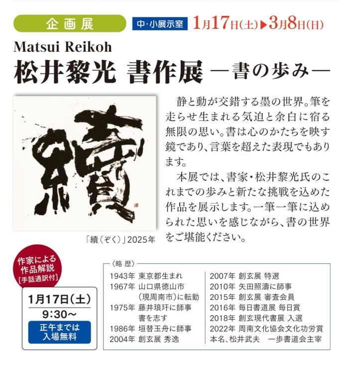 1月17日(土)から3月8日(日)まで、周南市郷土美術資料館・尾崎正章記念館(周南市富田永源、TOSOH PARK永源山内)中・小展示室では企画展「松井黎光 書作展―書の歩み―」を開催します。