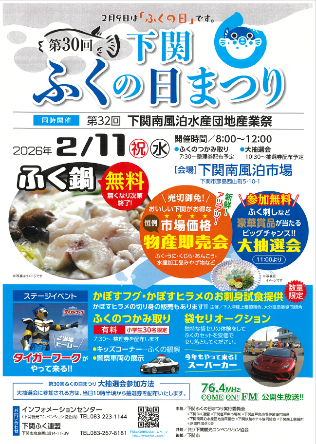 2月11日(水祝)8時から12時まで、下関南風泊市場(彦島西山町)で「第30回下関ふくの日まつり・第32回下関南風泊水産団地産業祭」が開催されます。
