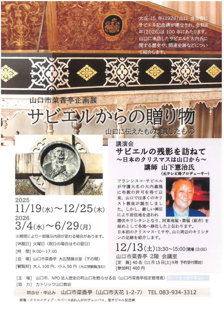 山口市菜香亭(山口市天花)大広間展示室(下の間)では、6月29日(月)まで企画展「サビエルからの贈り物~山口に伝えたもの、遺したもの」を開催中です。