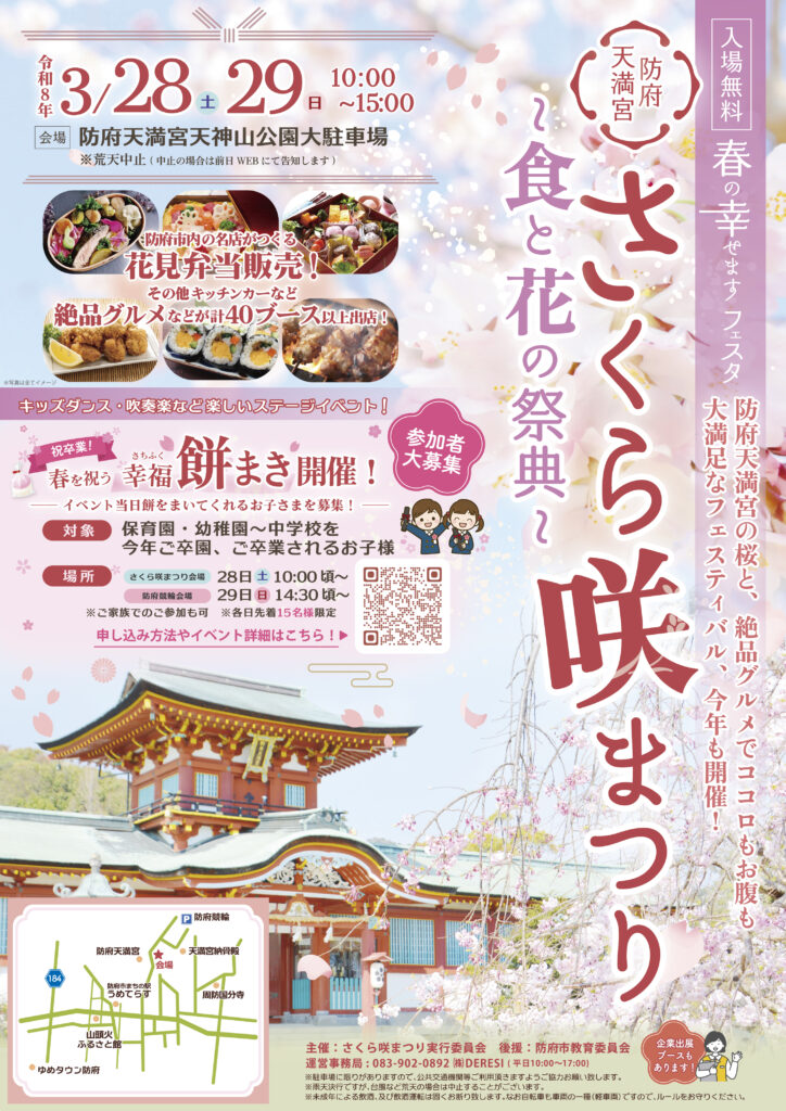 これは、防府天満宮境内の桜約450本の開花時期に合わせて開かれているまつり。今週末の3月28日(土)29日(日)各10時~15時には、グルメと桜のイベント「~食と花の祭典~」が催されます。