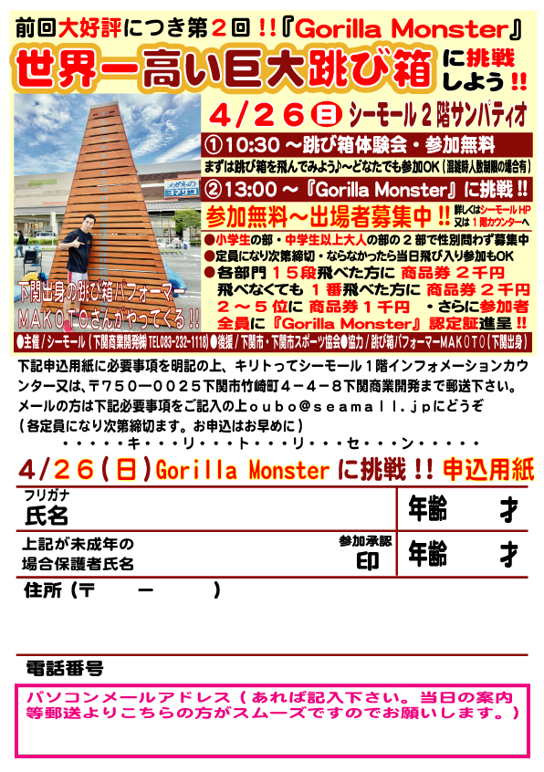 4月26日(日)10時30分から、シーモール(竹崎町)2階サンパティオで「第2回『Gorilla Monster』世界一高い巨大跳び箱に挑戦しよう‼」が開催されます。
