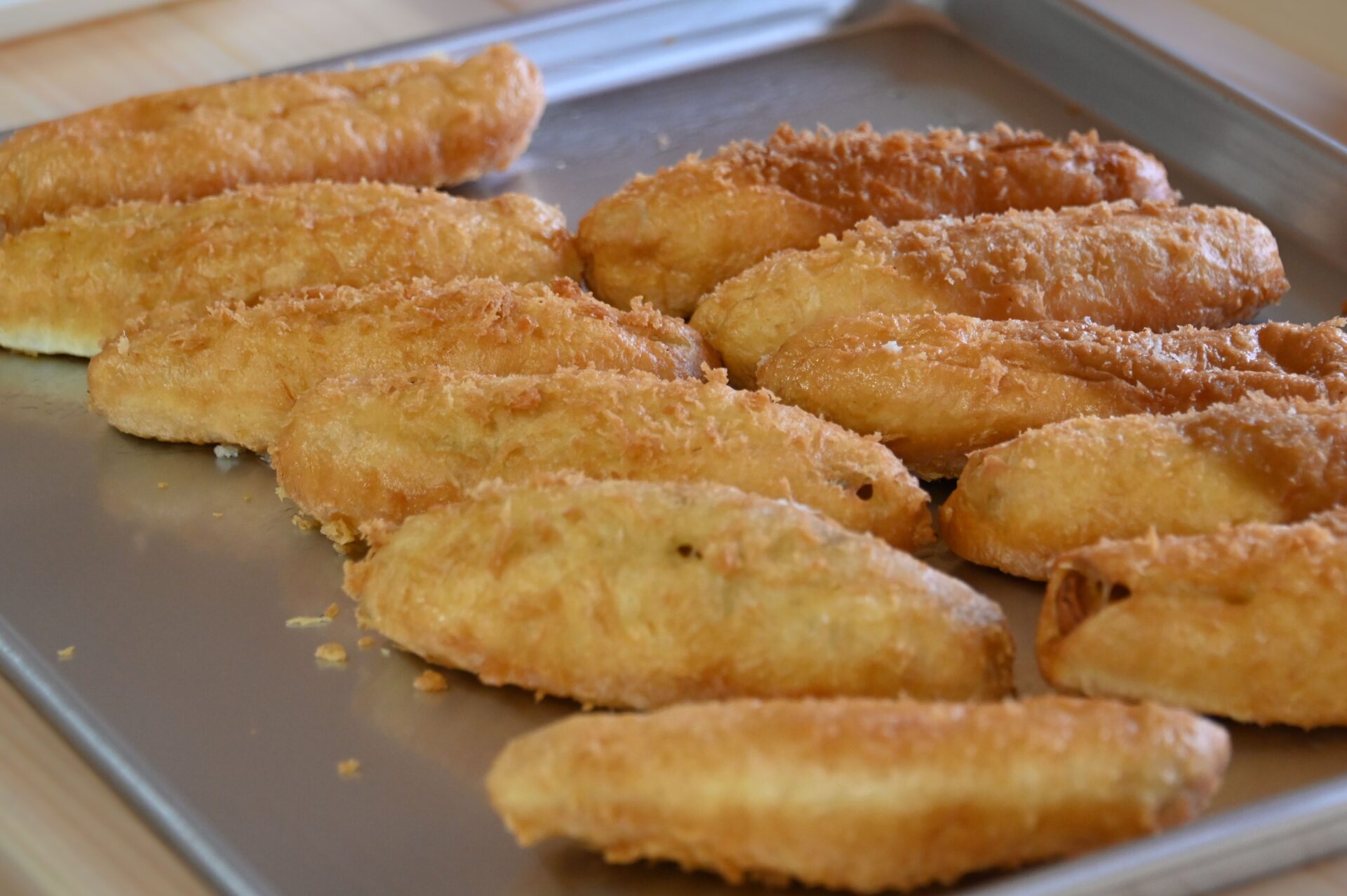 魚肉ソーセージ入りのカレー味揚げパンです。