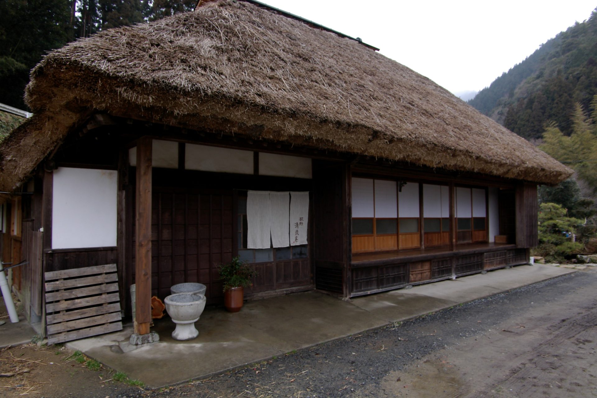 築150年の古民家を、地元の有志、山ロ大学などが協力して3年かけ修復・葺き替えた歌野清流庵。