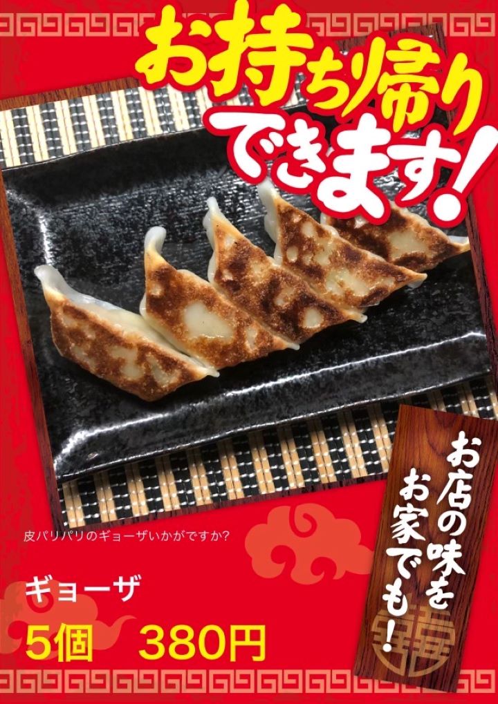 - 当店の人気サイドメニューを盛り込んだ「特製なごみ弁当」(550円)をはじめ、「お土産ラーメン」(1人前600円)、「ギョーザ」(5個350円)、「唐揚げ」(550円)などをどうぞご自宅で♪